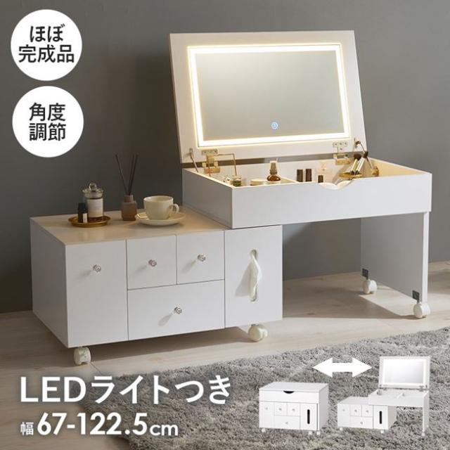 ドレッサー 鏡台 伸縮式コスメワゴン ワイド 鏡付き 可動式ミラー LED 女優ライト付き 幅67-122.5cm ほぼ完成品