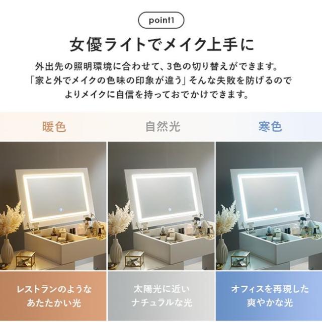 ●外出先の照明環境に合わせて、暖色・自然光・寒色の3色の切替ができます。