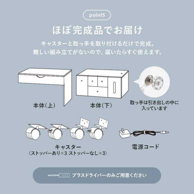 ●天板下収納・小物引き出し・背高引き出しなど大容量の収納でアクセサリーから化粧品まで様々なものを収納可能。