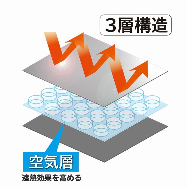 ●表面のアルミ素材で直射日光を反射し、内部の空気を含んだ緩衝材で遮熱効果を高めています。三層構造だから遮熱効率がアップ。