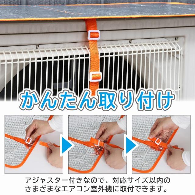●カバーを室外機の天面に載せて、ベルトで固定するだけのかんたん取り付け。アジャスター付きなので、対応サイズ以内のさまざまなエアコン室外機に取付できます。