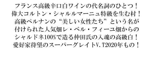フランス高級辛口白ワインの代名詞のひとつ!偉大コルトン・シャルルマーニュ特級を生む村!高級ペルナンの“美しい女性たち”という名が付けられた人気畑レ・ベル・フィーユ畑からのシャルドネ100%で造る仲田氏の入魂の高級白!愛好家待望のスーパーグレイトV.T2020年もの!