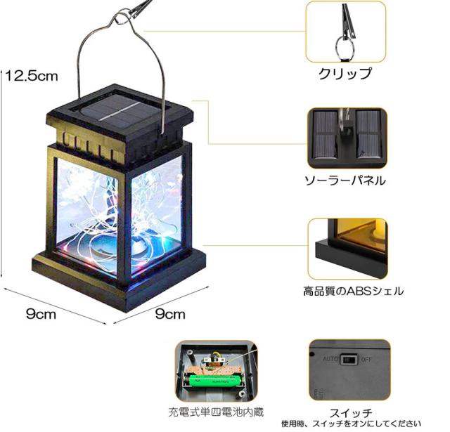【自動点灯・自動消灯】ソーラーパネルに明暗センサーを搭載し、晴れる日中は自動消灯、太陽光で充電し、夜間や暗い所で自動点灯でき、スイッチをオンのまま設置すれば、自動的に点灯/消灯する仕様となります。【省エネ・電気代0円】太陽光を蓄電して動くソーラーランタンなので、省エネ、お財布や地球環境に優しい。防風フックが付きで使いたい場所に吊り下げてとても便利です。