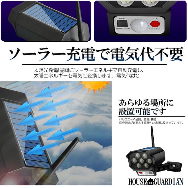 【商品仕様・ダミーカメラ型ライト】 材質:ABS、 | 電池容量:800mah|本体重さ:176G|防犯カメラと同じ外観を使用しているので,犯罪者に「防犯意識の高い家」という印象を与え大きな脅威となります。発光がセンサーライトとスポットライトの性能を綜合開発し進化した新品です。【省エネ】800mahの充電電池が内蔵しており、耐久性もっとUPです!完全に充電した後、人感モードでは一晩中使うことができます。太陽光発電な場合、昼間にソーラーエネルギで自動充電し、太陽エネルギーを電気に変換します。電気代は0、廃棄ガスを排出しない自然の力から生まれたクリーンなエネルギーで環境に優しいです。地震や台風などの災害では、電源がoffになっても、照明机能を保ち、避難の防止に貢献します。