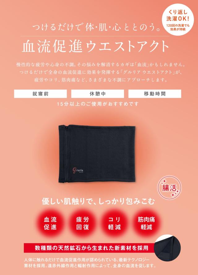 グルリアのウエストアクトならカラダの中心をしっかりと温めることで血行改善に繋がり、日々の疲れを癒してくれます。