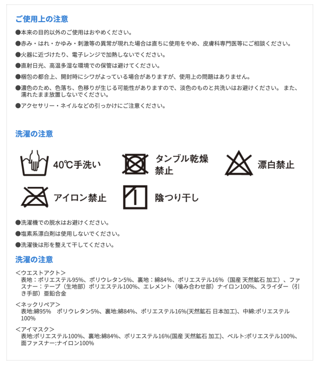 ファスナー:テープ(生地部)ポリエステル100%、エレメント(?み合わせ部)ナイロン100%、スライダー(引き手部)亜鉛合金