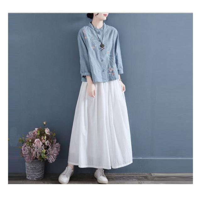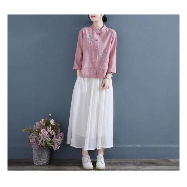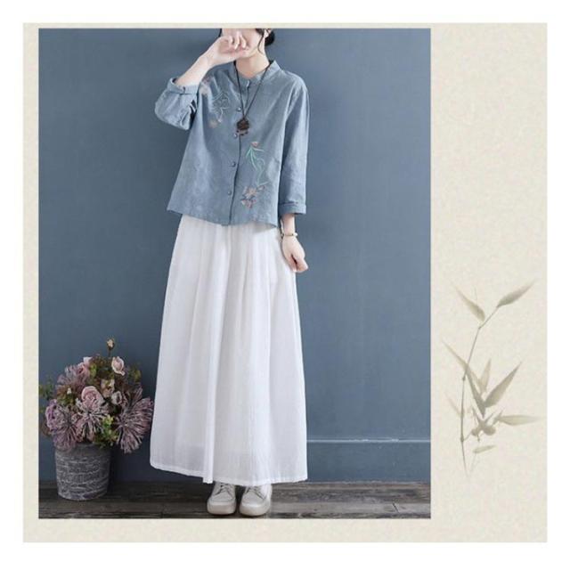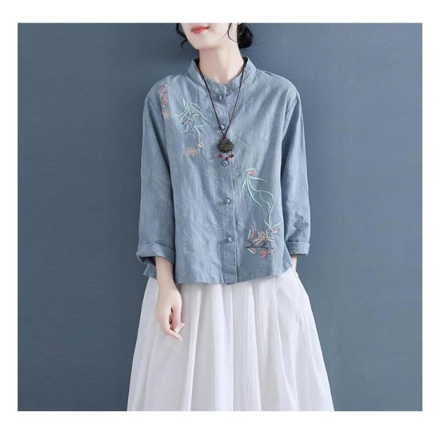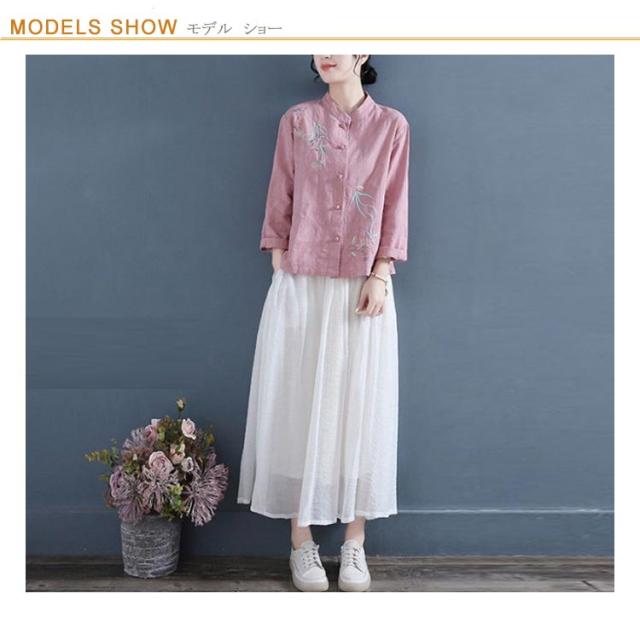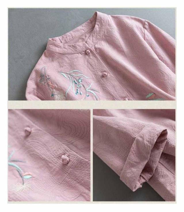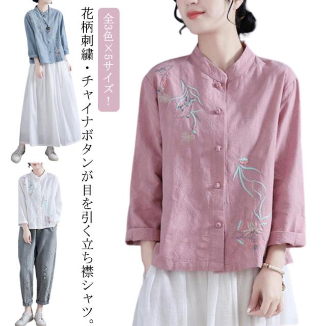 刺繍 送料無料 刺繍ブラウス チャイナシャツ 前開き 刺繍シャツ 立ち襟 30代 長袖 花柄 シャツブラウス トップス リネンシャツ レディース 綿麻 春 秋 40代 中華風