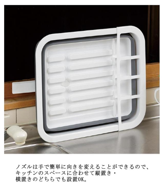 | 【スリムになる折りたたみ水切りかご】台所が狭い人におすすめ! 使わないときはたたんで、立て掛けることのできる水切りラックです。狭いキッチンのスペースを有効活用! 【水はけノズル付き】水はけノズルからシンクへ直接排水することができます。 ノズルは手で簡単に向きを変えることができるので、キッチンのスペースに合わせて縦置き・横置きのどちらでも設置OK。 わざわざラックを持ち上げて水を切る必要もないので手間要らずです! 【止水栓付きで便利】普段は濡れた食器を入れて乾燥させる食器ラックとして使えますが、止水栓をすれば中に水を貯められるので、食器の浸け洗いなども可能。 また、排水できない場所でも使用する際にも便利です。 【便利な仕様の水切りラック】カトラリーを分けて立てておける仕切りポケット付きなので、箸やスプーン、トングなどの調理用具を整理整頓! また、底には滑り止めが付いているので、濡れたシンクの周りに置いてもしっかりと滑らず安定して食器を乾かせます。 | |
