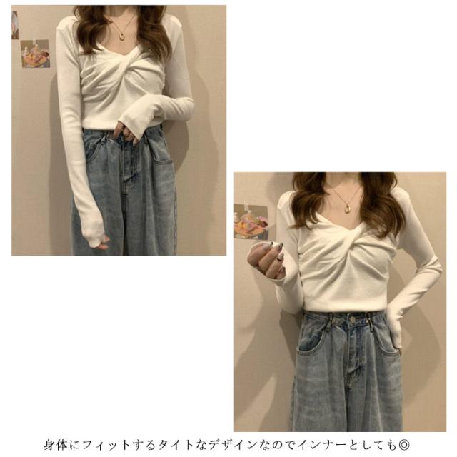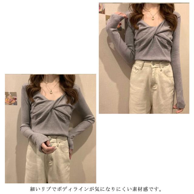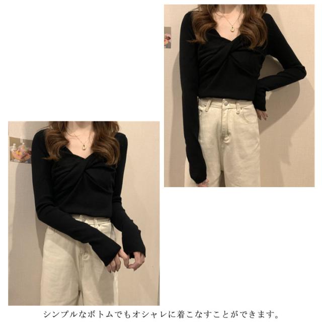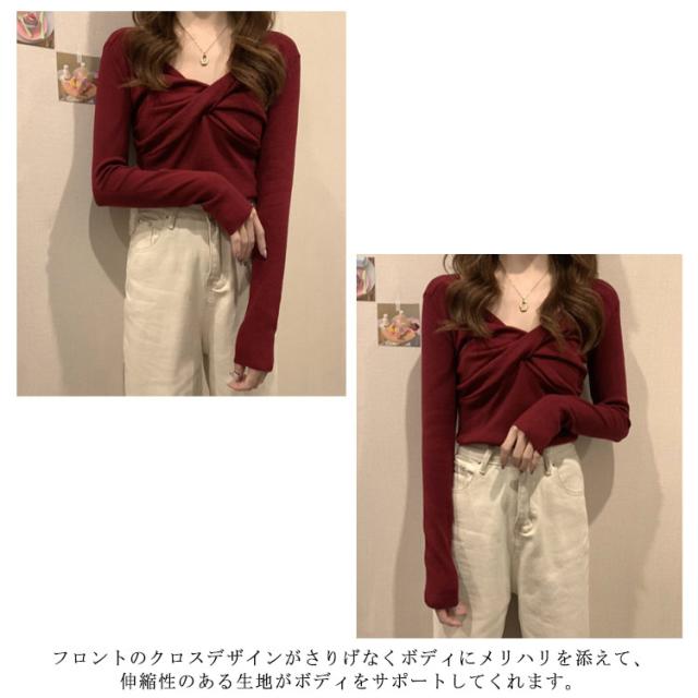 クロス リブ tシャツ カットソー Vネック 大人可愛い フロントクロス リボン レディース tシャツ リブニット トップス フェミニン 長袖 ブラウス 春 秋 服 通勤 オフィス デイリー 長袖tシャツ