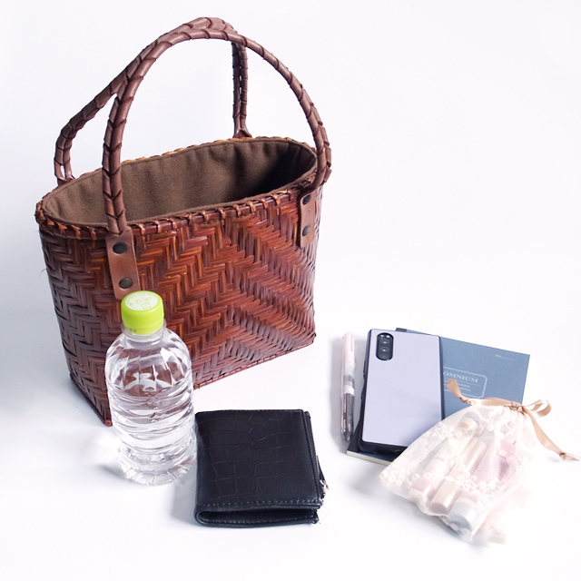 持ち手は革になっているので柔らかくて持ちやすく、巾着付きの裏地が付いているので、バッグが倒れても中身が飛び出す心配がありません。