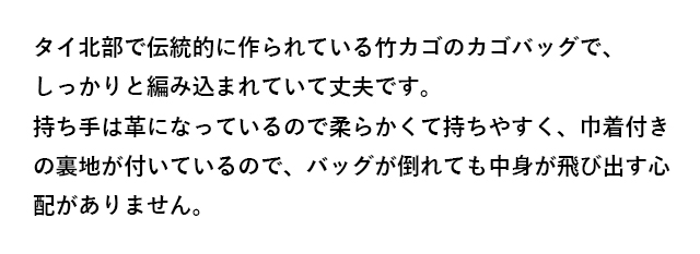 タイ北部で伝統的に作られている竹カゴのカゴバッグで、しっかりと編み込まれていて丈夫です。