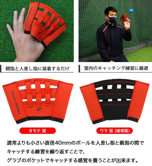 通常よりも小さい直径40mmのボールを人差し指と親指の間でキャッチする練習を繰り返すことで、グラブのポケットでキャッチする感覚を養うことが出来ます。