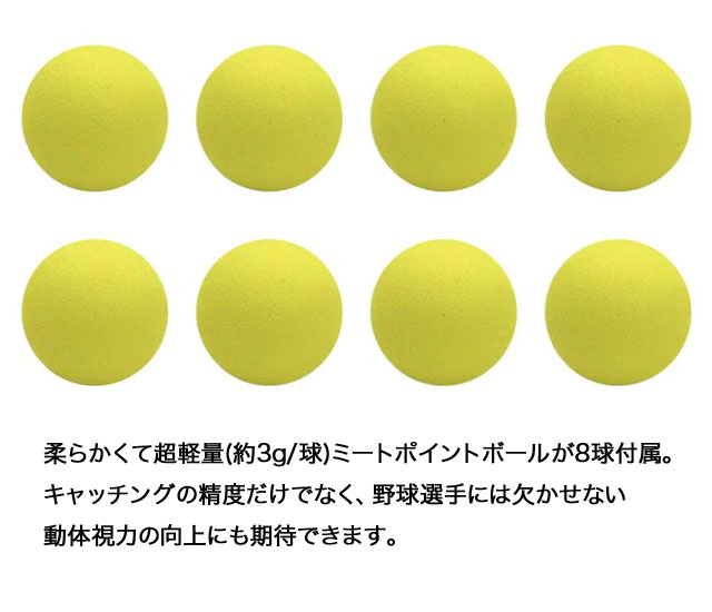 柔らかくて超軽量(約3g/球)ミートポイントボールが8球付属。キャッチングの精度だけでなく、野球選手には欠かせない動体視力の向上にも期待できます。