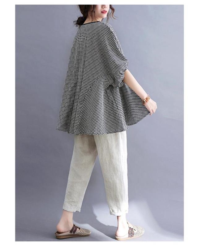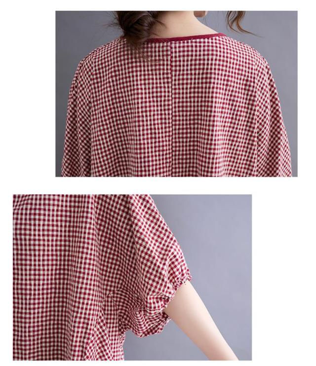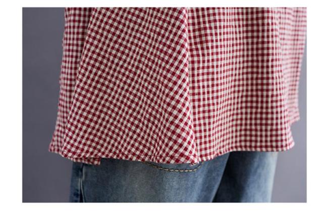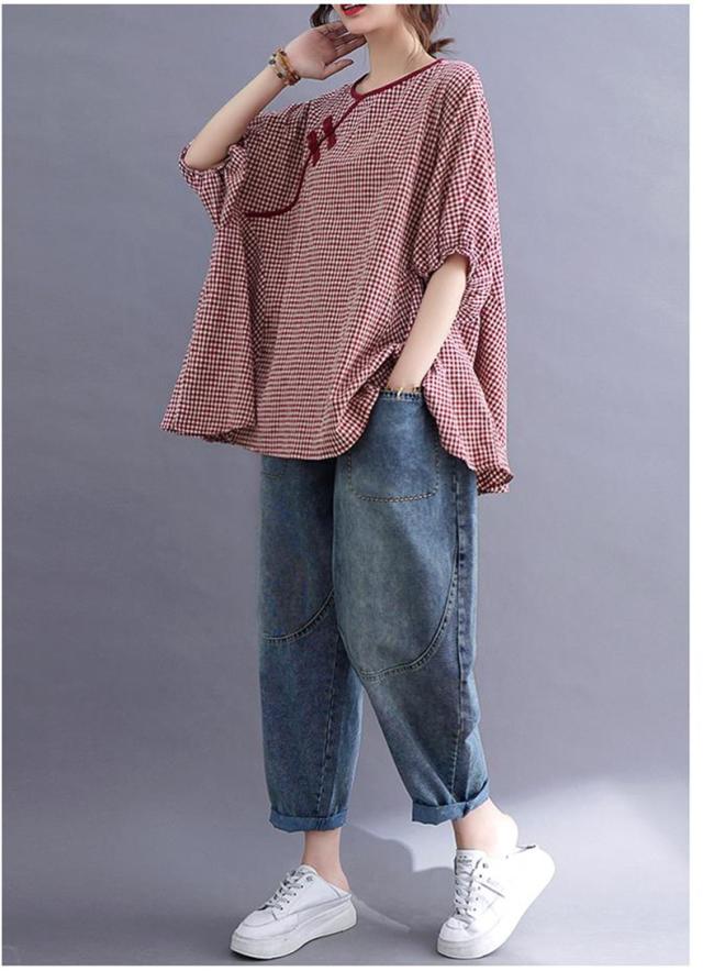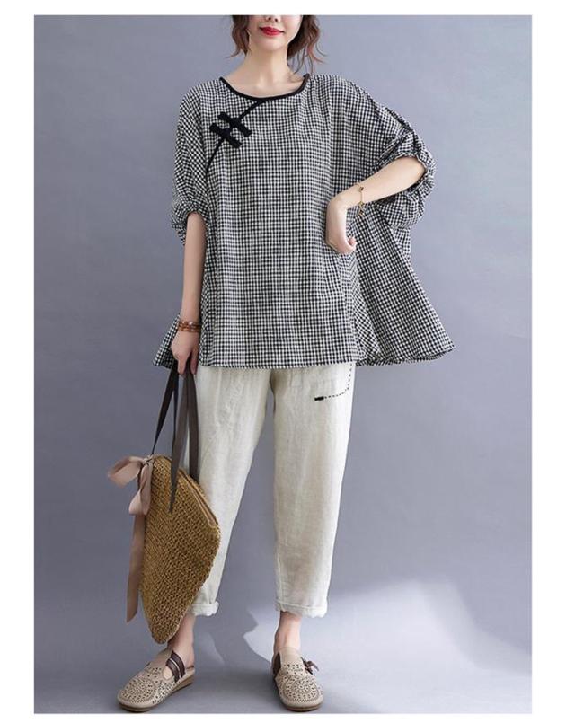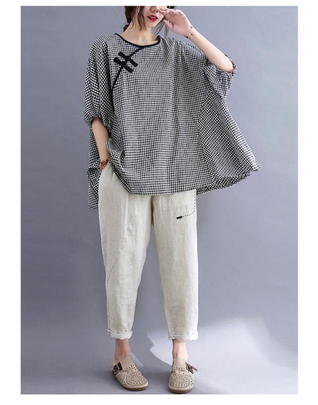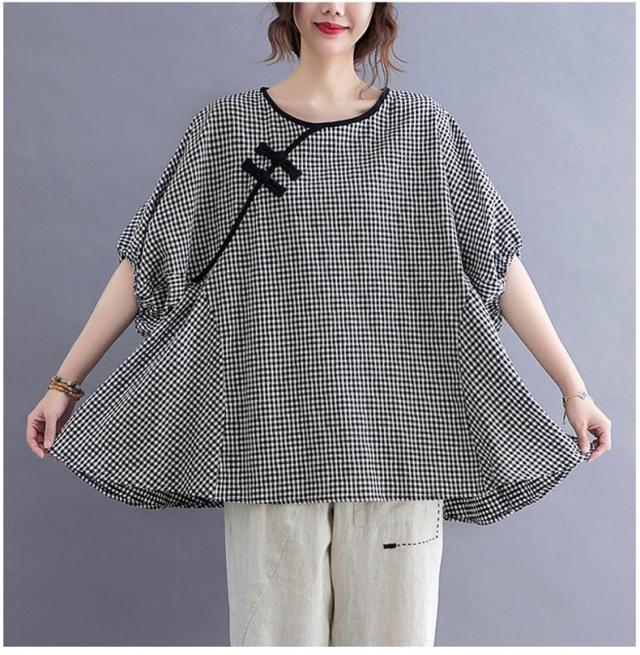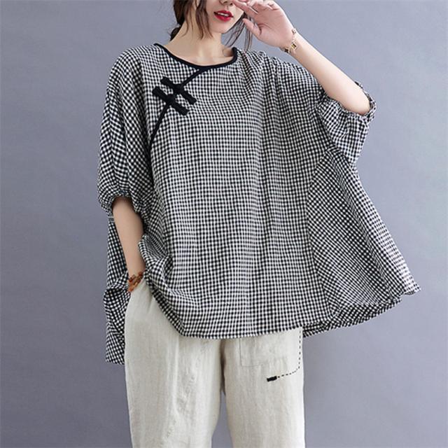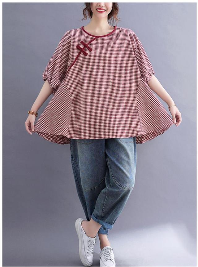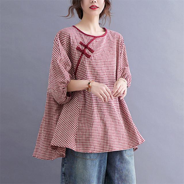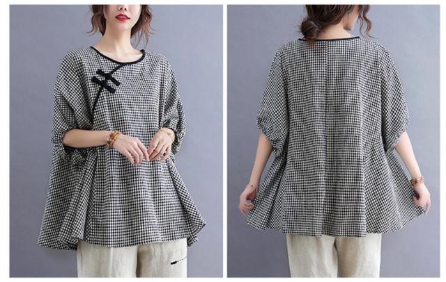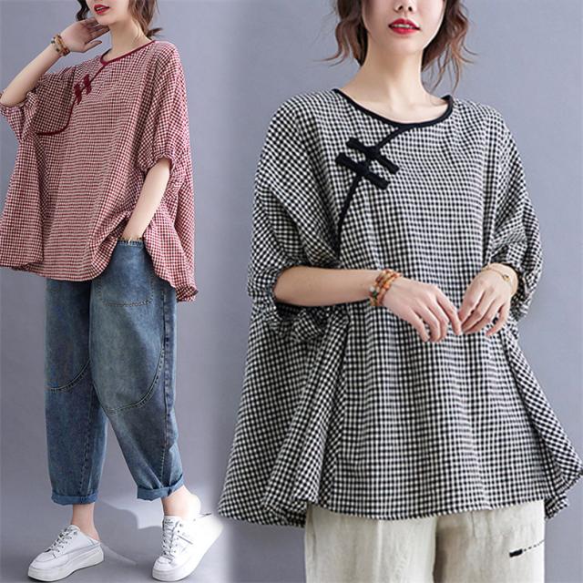 シャツ 夏 プルオーバー 手作りボタン 丸首 レトロ風 チェック柄 トップス レディース ゆったりとしたシルエット カジュアル