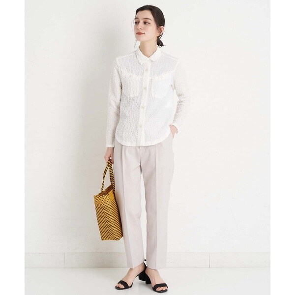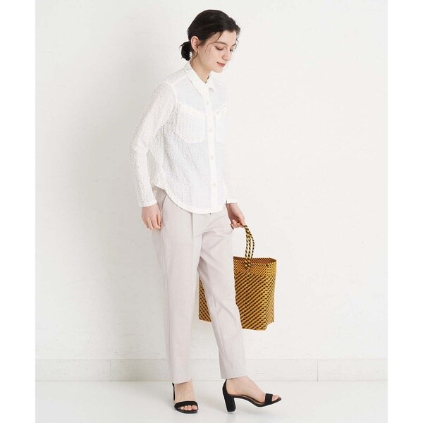 ソフトな風合いでストレッチ性のあるオックス素材のテーパードパンツ。 前はタックとセンタープレス入りですらっと脚をまっすぐ美脚に見せる効果あり。後ウエストはゴムを使用した仕様なのでヒップ周りはほどよいゆとりがあるパンツです。きれい目な印象を与えてくれるテーパードパンツですが、スニーカーを合わせたりパーカーを合わせたりとカジュアルアイテムとのコーディネートにもおすすめです。