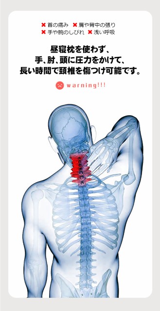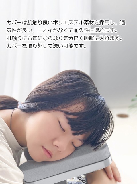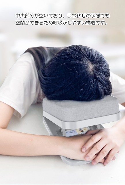 【腕に圧迫しません】お昼寝枕の中央部分が空いており、うつ伏せの状態でも空間ができるため呼吸がしやすい構造です。またうたた寝時に、下の空間に腕を入れられるので、腕を圧迫されるしびれがなく、確実にお昼寝の快適さをアップします。