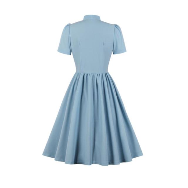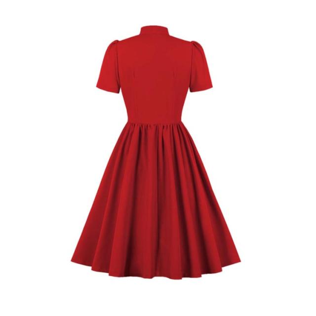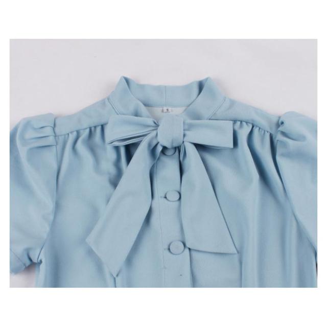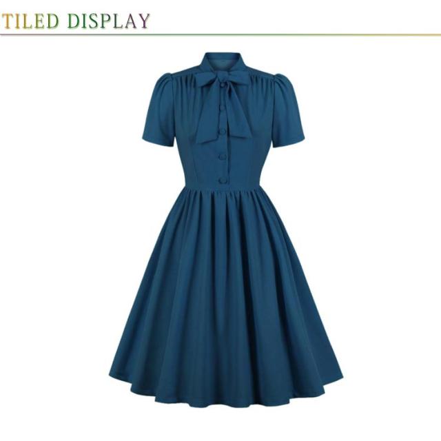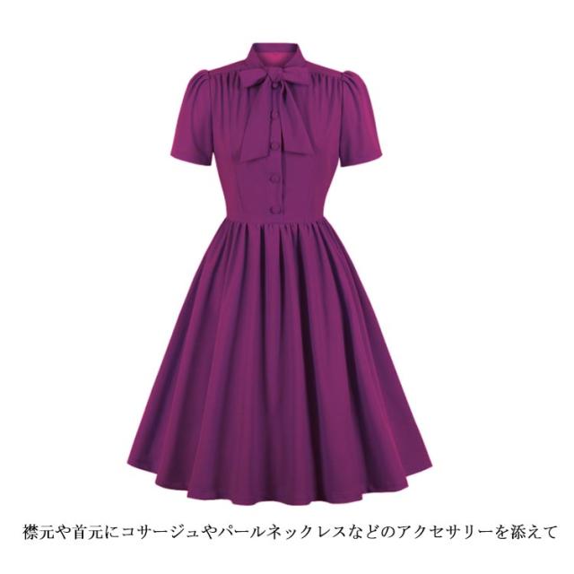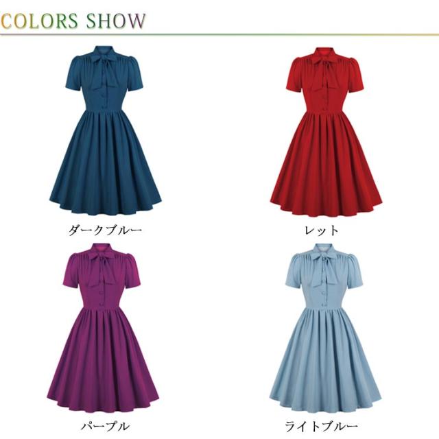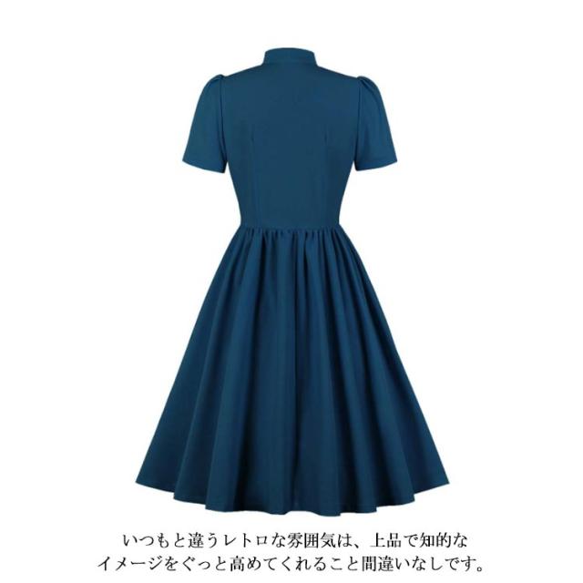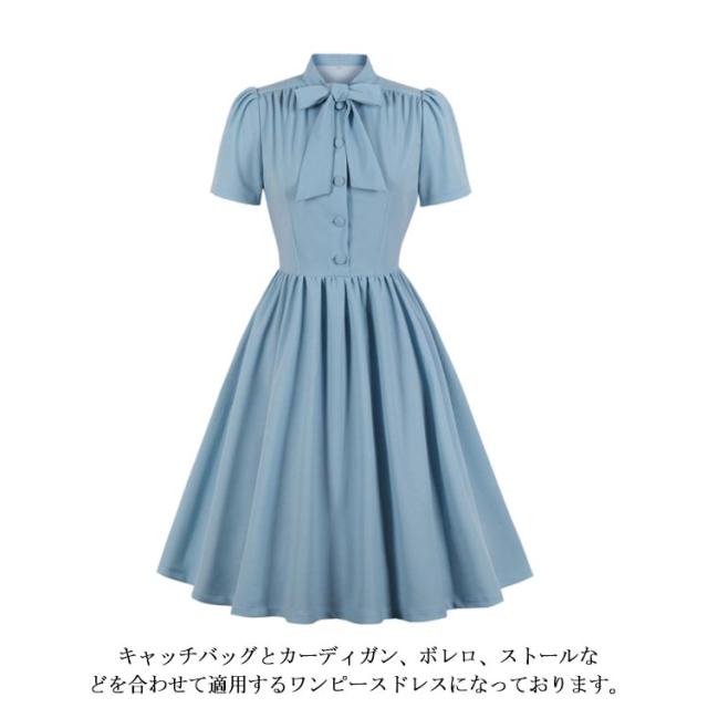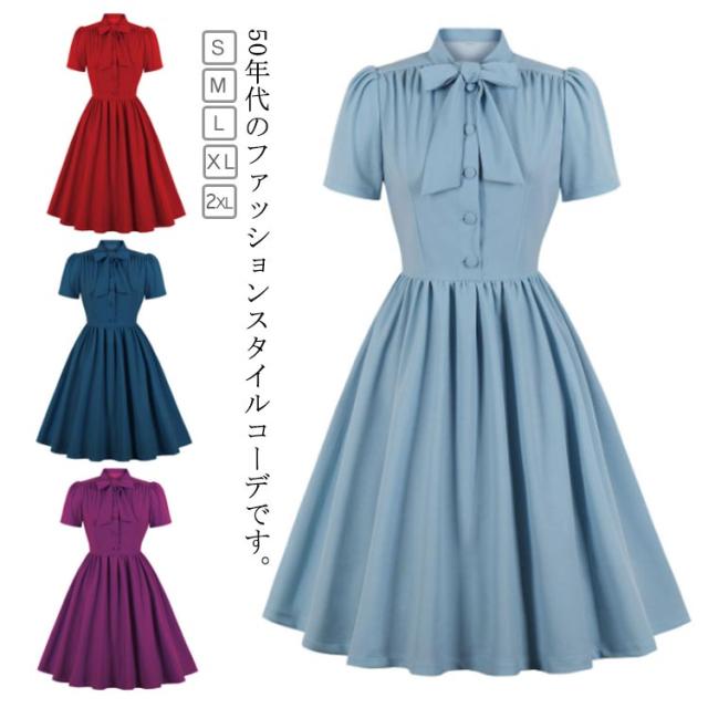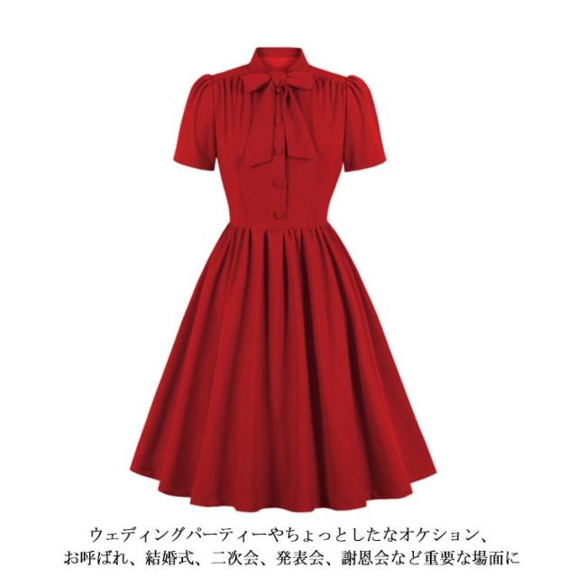 ワンピース レディース 春夏 ドレス 50年代 レトロワンピース リボン付き 膝丈 襟付き 半袖 Aライン ワンピース フレアワンピース お呼ばれ