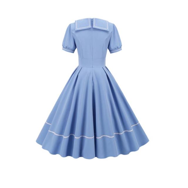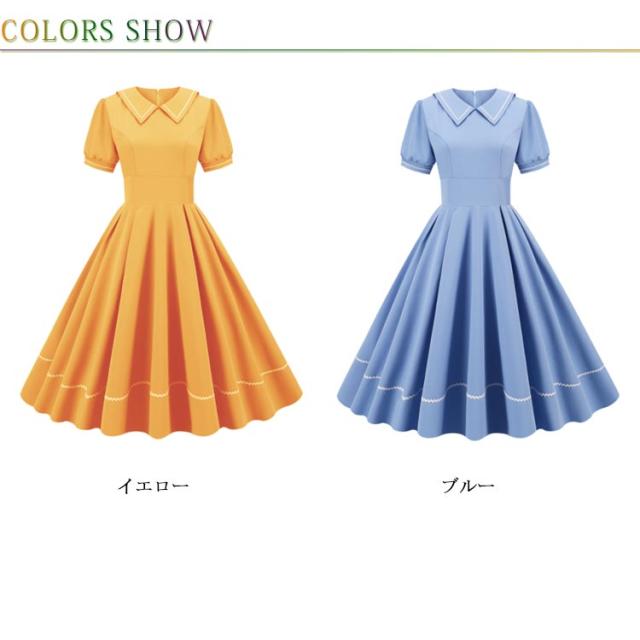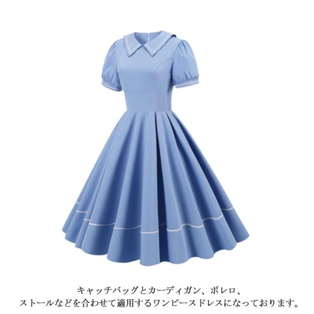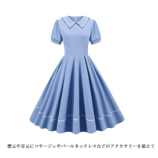 レトロワンピース ワンピース 夏 レトロ ドレス 襟あり Aラインワンピース 半袖 ハイウエスト 可愛い 着痩せ ボタン 膝丈 50年代 お呼ばれ 恩会 披露宴 オールシーズン