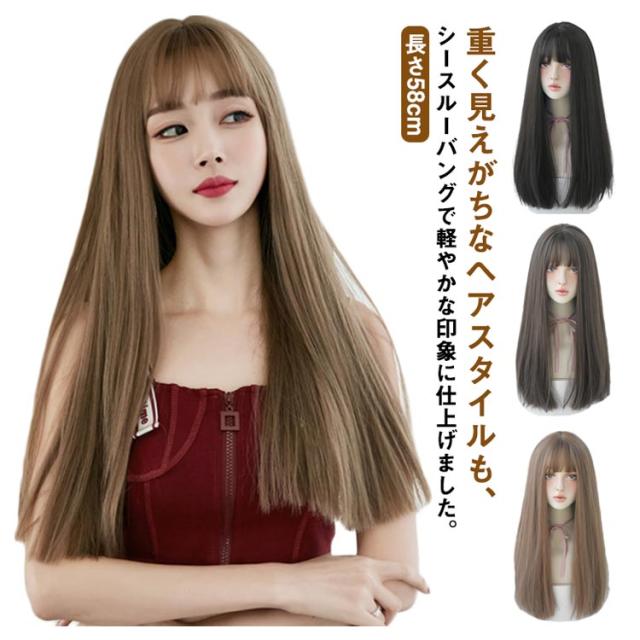 ウィッグ ロング ストレート シースルーバング フルウィッグ かつら ファッション 普段使い 黒髪 女性 医療用 ウィッグ 前髪ぱっつん 耐熱ウィッグ コスプレ レディース ナチュラル 自然 小顔効果 送料無料