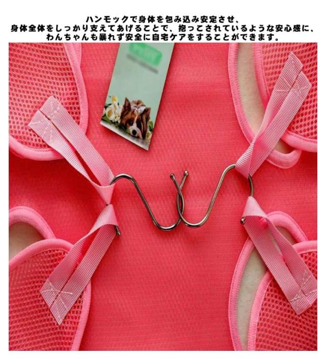 | 嫌がって暴れるペットの自宅ケアに! 爪切り、トリミング、歯みがき、目薬・服薬など、わんちゃんが嫌がる自宅ケア。 嫌がって暴れたらケガをさせちゃうかも…という心配を、グルーミングハンモックを使って解決! ハンモックで身体を包み込み安定させ、身体全体をしっかり支えてあげることで、抱っこされているような安心感に、わんちゃんも暴れず安全に自宅ケアをすることができます。 通気性優れるのメッシュデザイン、嫌がるわんちゃんを無理やり押さえつける必要もなく、わんちゃんも飼い主さんも負担を減らせて、ストレスなくお世話ができます。 設置は簡単!付属のS字フックをハンモックの穴に通して吊るすだけ! わんちゃんの身体の大きさや用途に合わせてご使用下さい。 | |