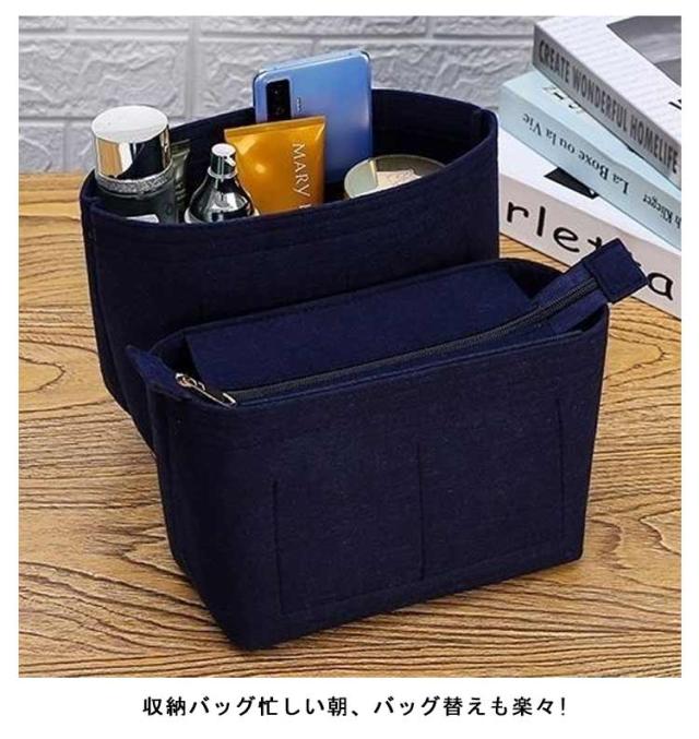 | トートバッグにピッタリの バッグインバッグ。 素材にフェルトを使う事で軽量でありながらもしっかり自立する作りになってます。 小物が散らかりがちなトートバッグなどの中身をスッキリ整頓できます。 収納バッグ忙しい朝、バッグ替えも楽々! | |