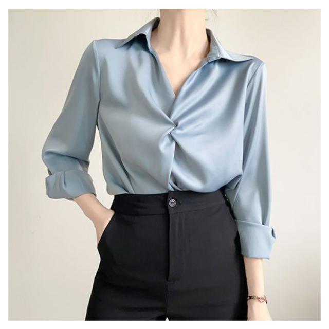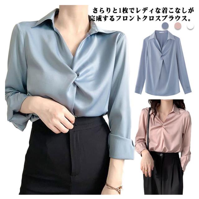 長袖 ブラウス フロントクロス サテン レディース 通勤 オフィス 長袖シャツ クロス トップス フェミニン OL きれいめ 春夏秋 大人 通勤シャツ 接触冷感 無地 シンプル 30代 40代 50代 おしゃれ【送料無料】