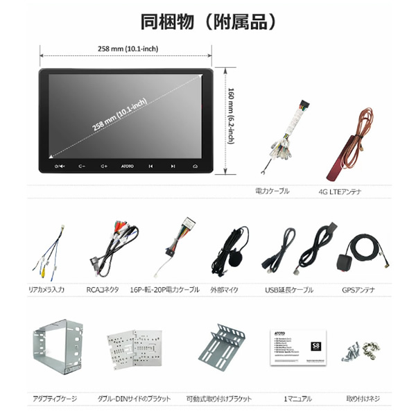 ※取り付けサービスは行っておりません。 ※初期不良等の場合に発生する取付・取外し作業や、車両に関わる保障はございません。あらかじめご了承願います。 ※車両により、取り付けキットが必要な場合がございます。必ずメーカーページにてご確認ください。 10インチの後付け カーナビゲーション ■システム情報:SoCチップ:UIS9863オクタコア1.6GHz(ARM Cortext A55) ■システムバージョン:Android Q(10.0)に基づいて開発したスタマイズATOTO AICE UI 11.0 ■システム言語:英語、ドイツ語、フランス語、イタリア語、スペイン語、ポルトガル語、日本語、ロシア語、アラビア語、およびその他の12言語。 ※記載は商品仕様の一部です。仕様説明不足等の理由での返品はできません。特に適合等は必ずご確認ください。