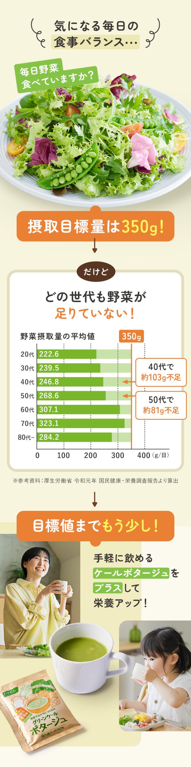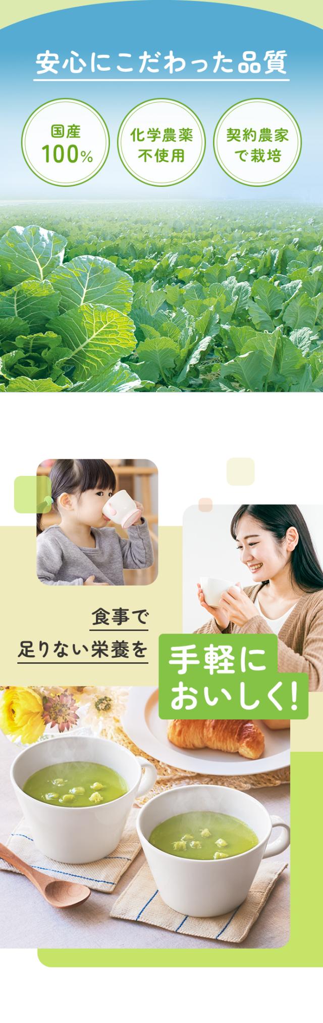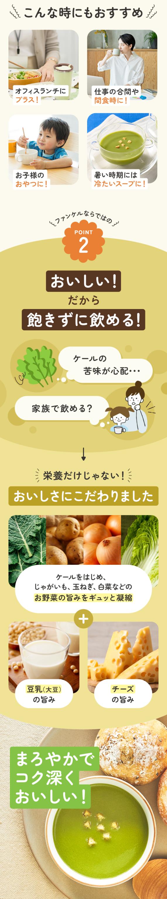 1杯で1食分の緑黄色野菜量(ケール生葉40g)を使用した濃厚ポタージュが、たくさんのリクエストにお応えしついに定番化。国産ケールにじゃがいも、玉ねぎ、白菜をプラスし、野菜の旨味をギュっと凝縮。さらに豆乳パウダーとチーズを加えた本格派。まろやかでコク深い味わいを引き出し塩分を抑えました。