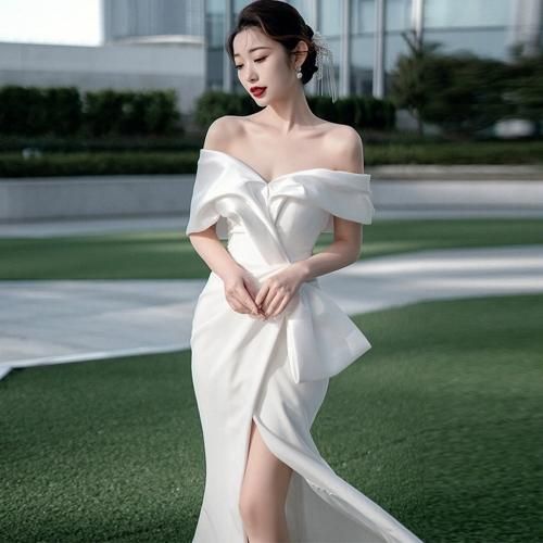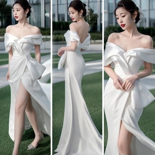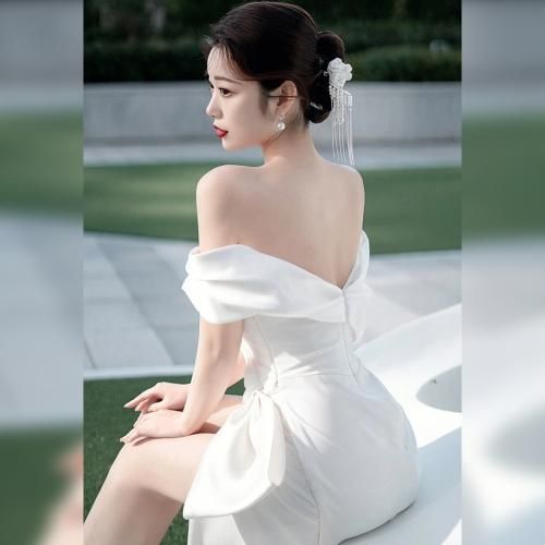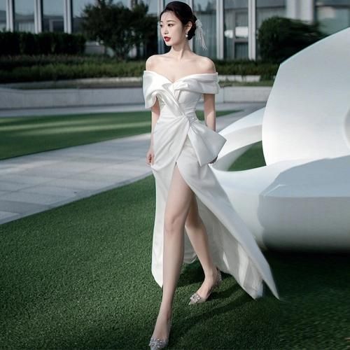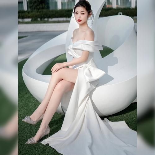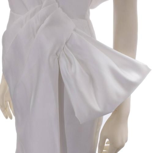 少し厚めのマットサテンを使用し、大きなリボン風のデザインが特徴的なホワイトドレス。