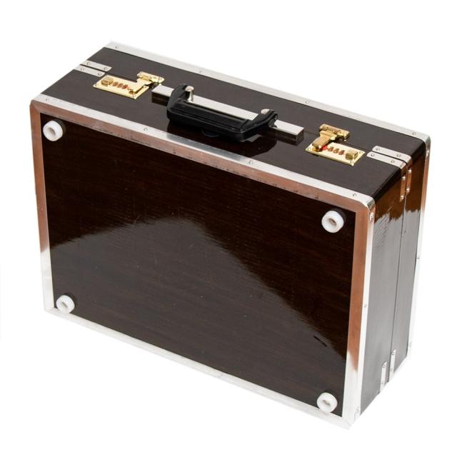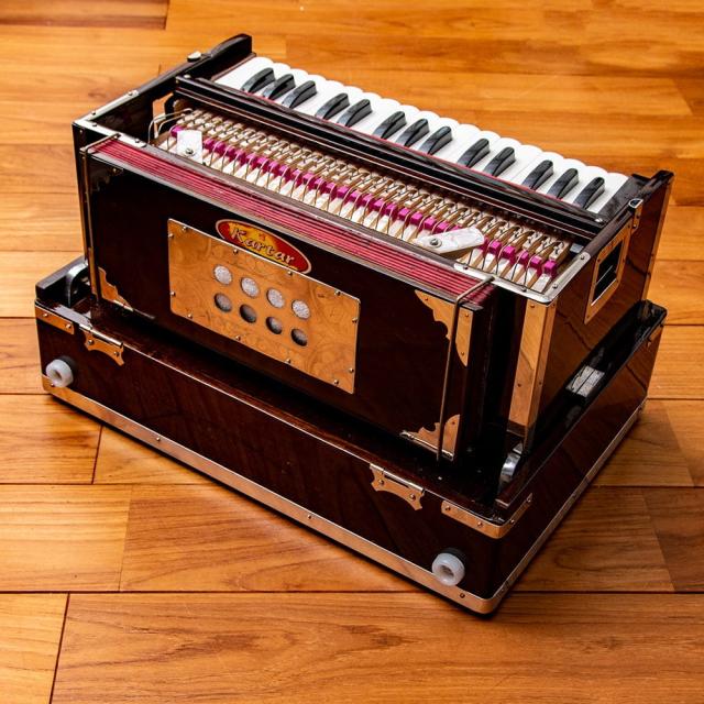 箱の中から出てきてポップアップする、持ち運びに便利なタイプのハルモニウム。アンティーク調の筐体もエレガントで素敵です。リードノブは2つあり音色のコントロールができます。その他にも3つのドローン音がつき、またどちらの手からでもふいごを操作できる左利きの方にも便利な作りになっています。上蓋はネジ式ではなくロック式のため、リードの調整などの際に内部へのアクセスが容易になっておりメンテナンス性もよいです。■ハルモニウムのメンテナンスについて