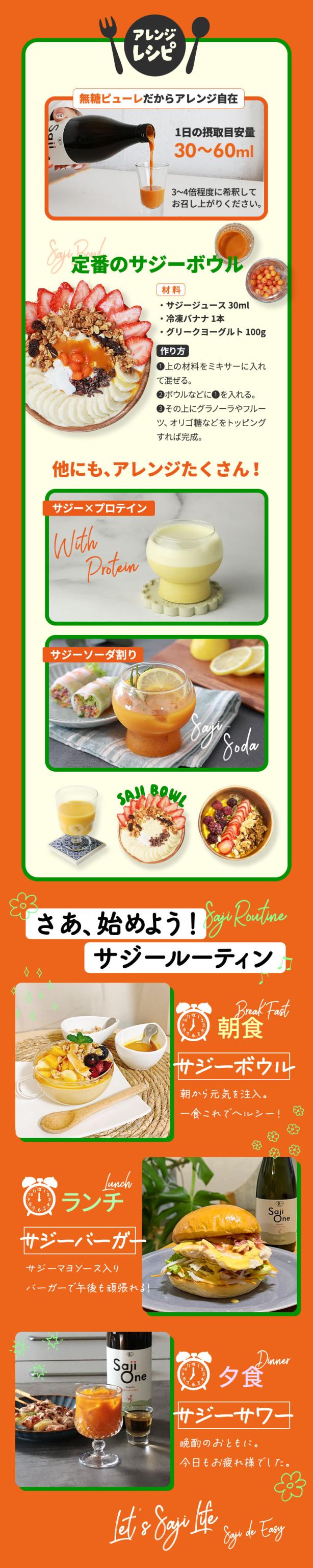 1日30〜60mlを目安に、3〜4倍程度に希釈してお飲みください。※3倍希釈時果汁33%(サジー1:水など2)