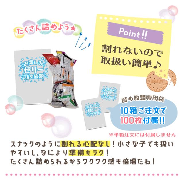 | 子供会やお祭りなどのイベントで楽しめる詰め放題ひとくちこんにゃくゼリーです。手軽に食べられる個包装タイプのこんにゃくゼリーなので、手も汚れずにお子様にぴったり!部活や福祉施設、給食などの業務用にもおすすめです。 |
