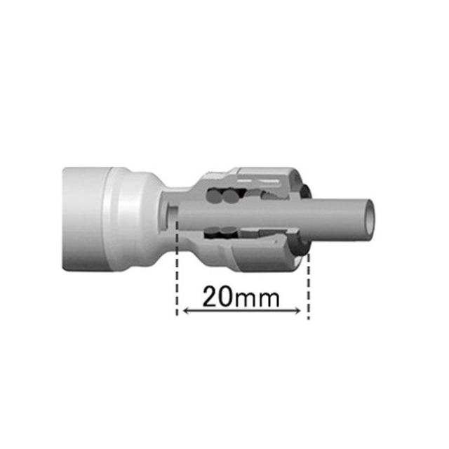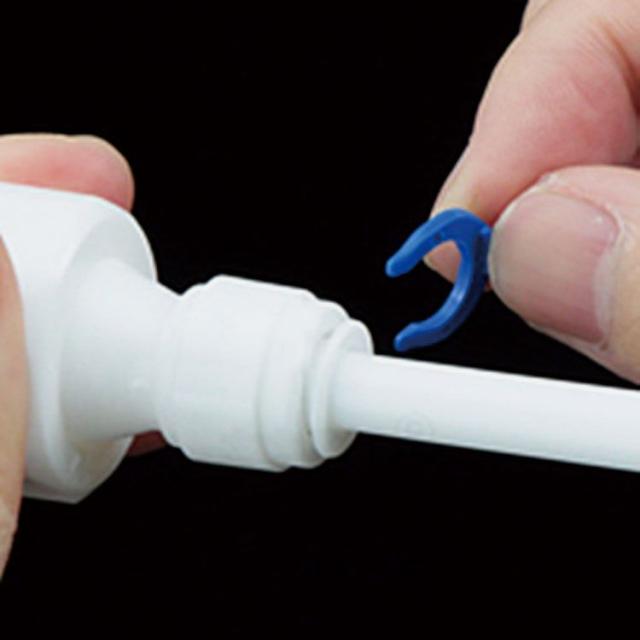 ホース内での水量を調整する事が出来ます。青のロックワッシャーを一度外し、垂直にカットしたホースを奥(20mm)まで差し込み、その状態でロックワッシャーを再装着すれば抜けません。ツマミを回して水の流れる量を調整してください。(ホースが斜めにカットされていたり、歪んでいると水漏れの原因となりますのでご注意ください。)
