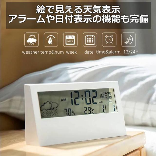 アラーム、天気表示、日付表示、温度・湿度表示、曜日表示
