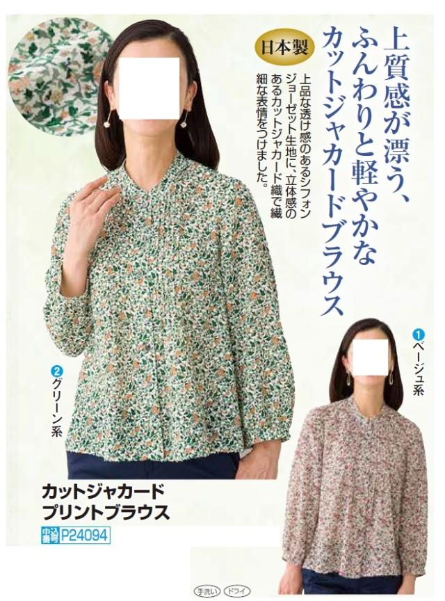 ブラウス レディース シニア 春夏 日本製 カットジャカードプリントブラウス 全2色 花柄 婦人服 ミセス 女性 グリーン ベージュ スタンドカラー バンドカラー シフォンブラウス ジャカード 小花柄 40代 50代 60代 70代 80代 母の日 お母さん プレゼント fuji p24094