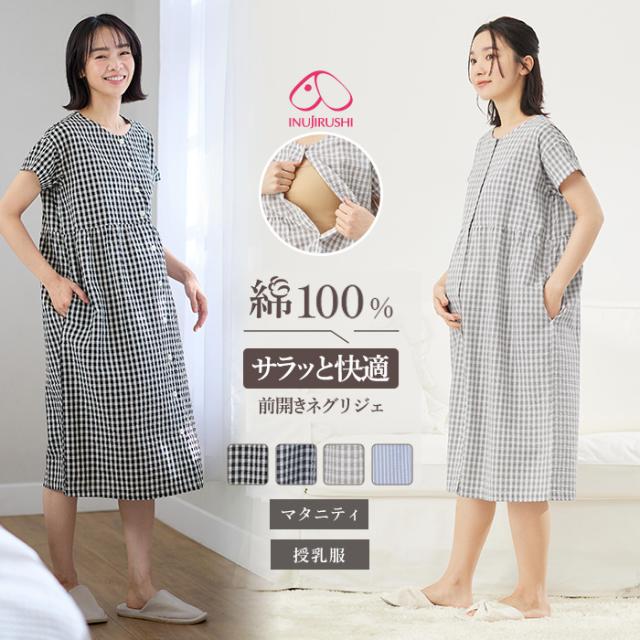マタニティ パジャマ 半袖 前開き 綿100% 授乳服 fairy ネグリジェ ワンピース ストライプ チェック M L コットン 産院着 部屋着