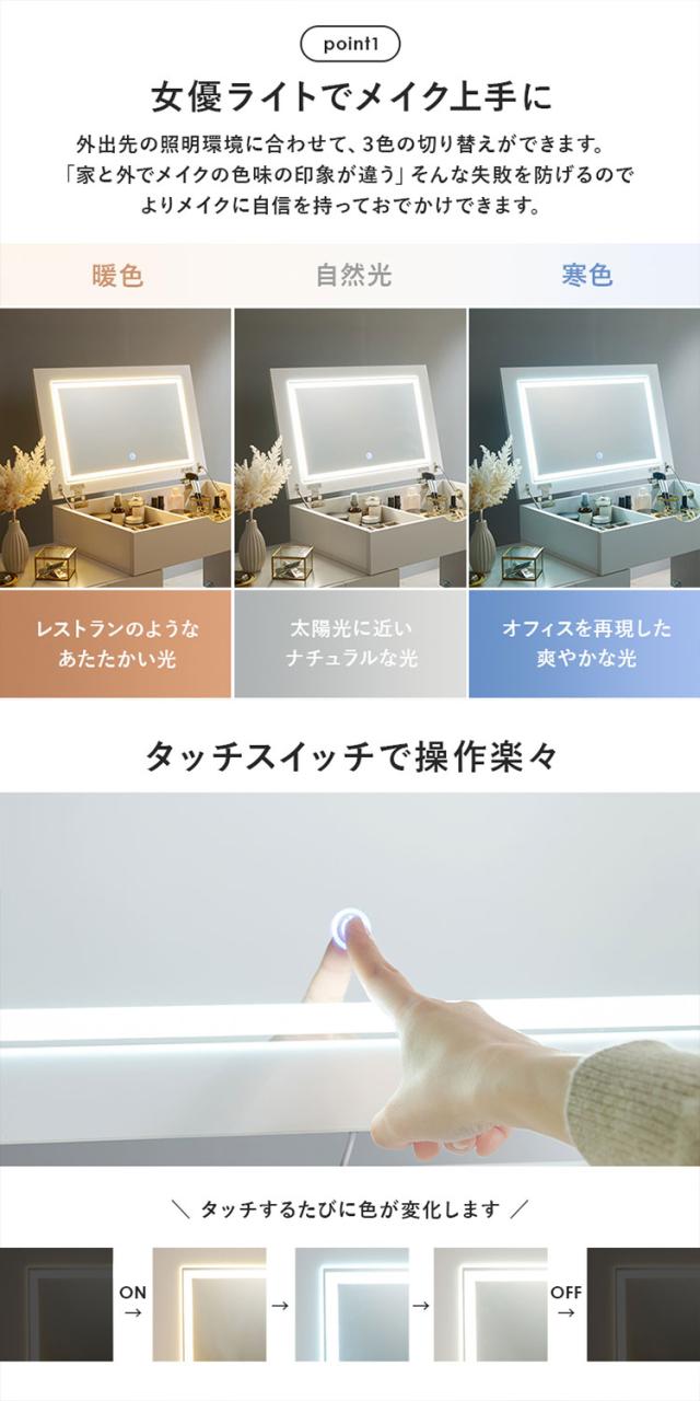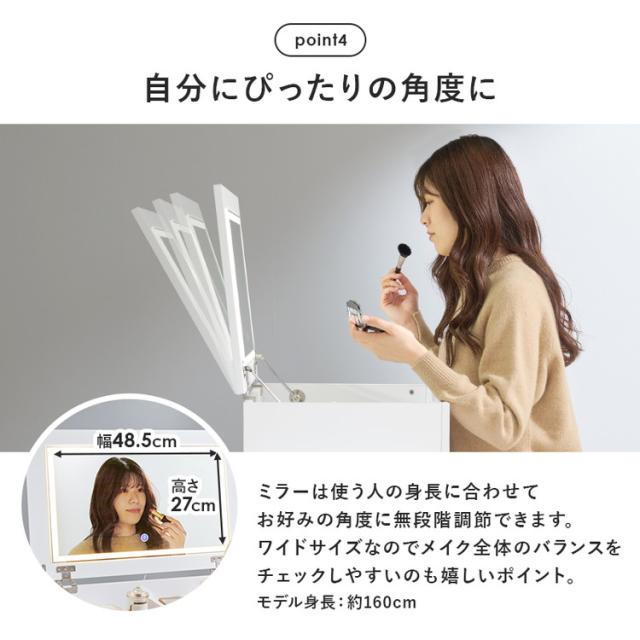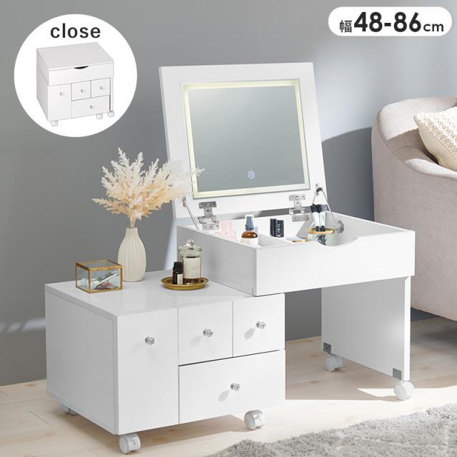 LEDの女優ライト付きでメイク上手になれるコスメワゴン。大容量な収納に加え伸縮式なので、お部屋のレイアウトに合わせて幅が変えられます。