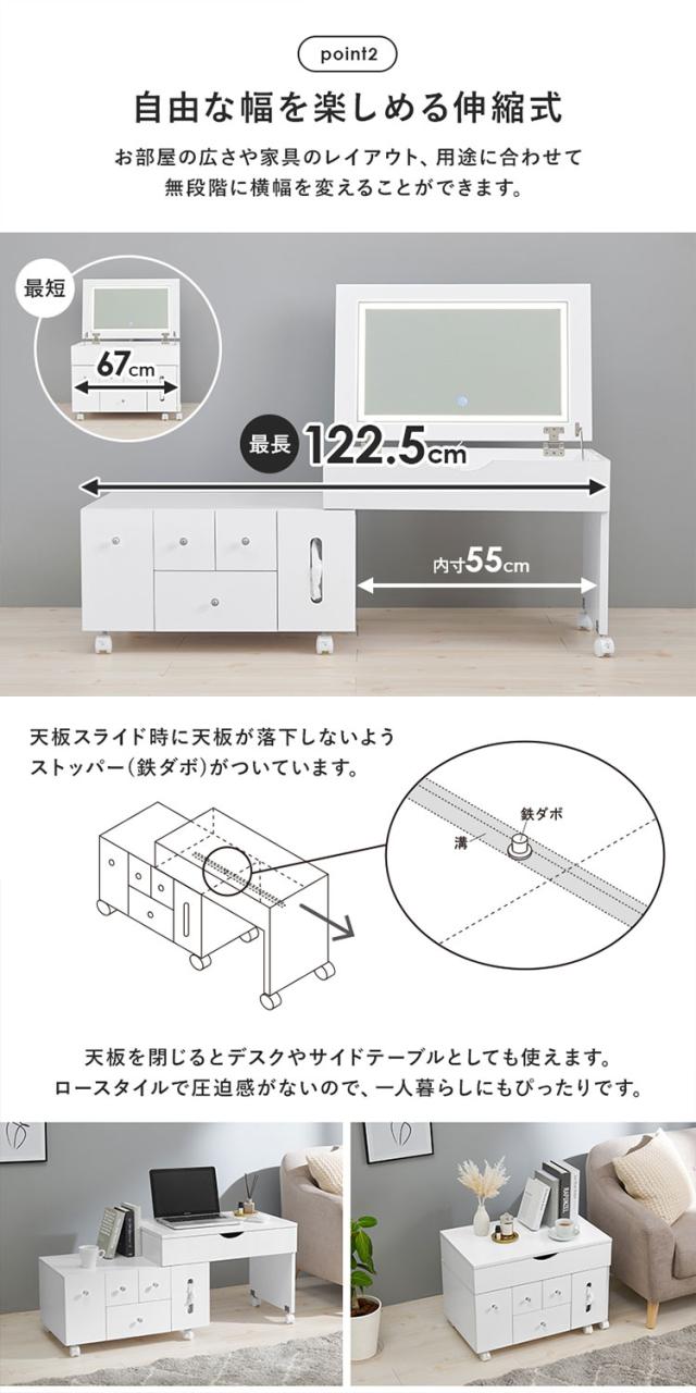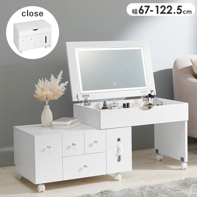 伸縮式コスメワゴン 幅67~122.5cm ロータイプ コスメワゴン キャスター付き LEDライト ホワイト コスメボックス コスメテーブル ドレッサー 化粧台 ミラー付き デスク 女優ライト 伸縮ドレッサー(代引不可)【送料無料】
