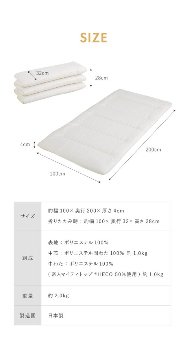 サイズ シングルサイズ:約幅100×奥行200×厚さ4cm