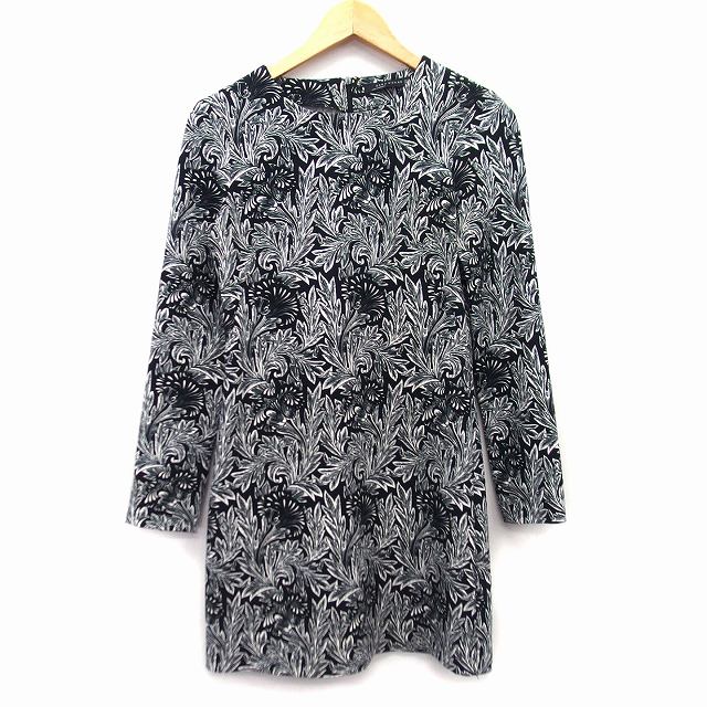 【中古】ザラウーマン ZARA WOMAN ワンピース 膝丈 花柄 リーフ柄 長袖 丸首 XS ブラック 黒 /HT10 レディース