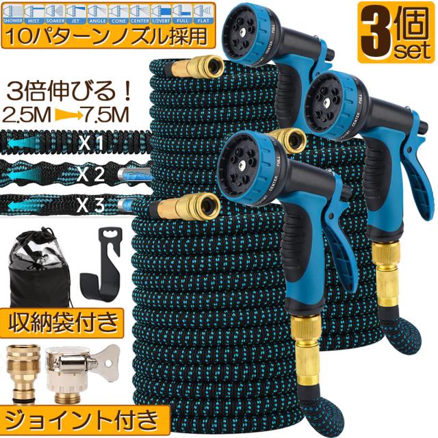 ホース 散水ホース 3個セット ホースリール 伸縮ホース 伸びるホース 洗車ホース 3倍に伸びる 10パターンノズル 超軽量 伸びるホースノズル 散水ノズル コンパクト収納 洗車 ガーデニング 庭 ベランダ 玄関 散水 大掃除 収納袋 付き