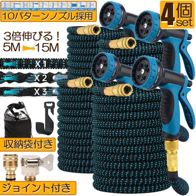ホース 散水ホース 4個セット ホースリール 伸縮ホース 伸びるホース 洗車ホース 15M 3倍に伸びる 10パターンノズル 超軽量 伸びるホースノズル 散水ノズル コンパクト収納 洗車 ガーデニング 庭 ベランダ 玄関 散水 大掃除 収納袋 付き