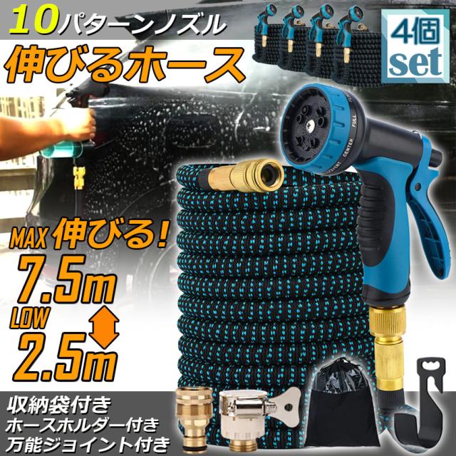 ホース 散水ホース 4個セット ホースリール 伸縮ホース 伸びるホース 洗車ホース 3倍に伸びる 10パターンノズル 超軽量 伸びるホースノズル 散水ノズル コンパクト収納 洗車 ガーデニング 庭 ベランダ 玄関 散水 大掃除 収納袋 付き
