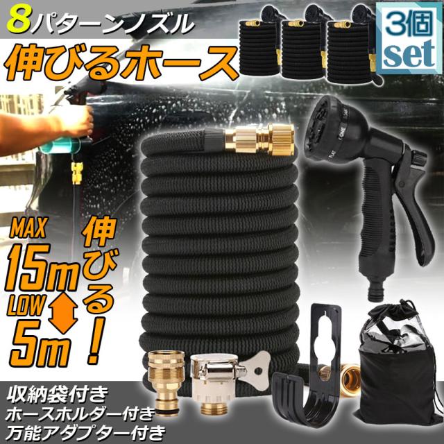 ホース 散水ホース 3個セット ホースリール 伸縮ホース 伸びるホース 洗車ホース 3倍に伸びる 15Mまで 超軽量 伸びるホースノズル 散水ノズル コンパクト収納 洗車 ガーデニング 庭 ベランダ 玄関 散水 大掃除 収納袋 付き