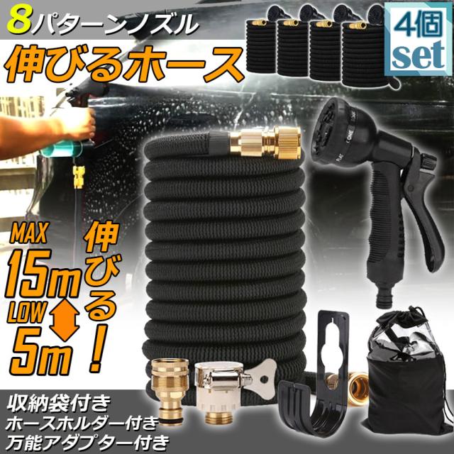 ホース 散水ホース 4個セット ホースリール 伸縮ホース 伸びるホース 洗車ホース 3倍に伸びる 15Mまで 超軽量 伸びるホースノズル 散水ノズル コンパクト収納 洗車 ガーデニング 庭 ベランダ 玄関 散水 大掃除 収納袋 付き