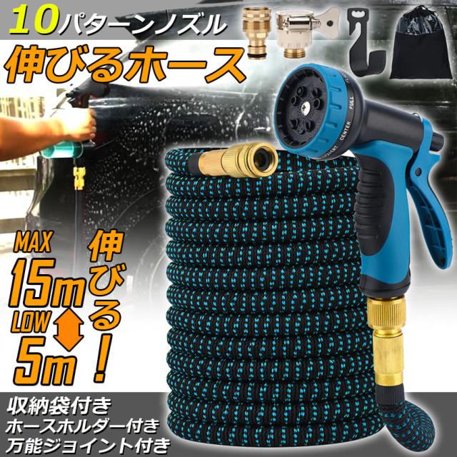 ホース 散水ホース ホースリール 伸縮ホース 伸びるホース 洗車ホース 15M 3倍に伸びる 10パターンノズル 超軽量 伸びるホースノズル 散水ノズル コンパクト収納 洗車 ガーデニング 庭 ベランダ 玄関 散水 大掃除 収納袋 付き