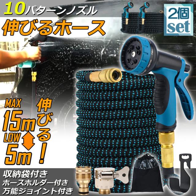 ホース 散水ホース 2個セット ホースリール 伸縮ホース 伸びるホース 洗車ホース 15M 3倍に伸びる 10パターンノズル 超軽量 伸びるホースノズル 散水ノズル コンパクト収納 洗車 ガーデニング 庭 ベランダ 玄関 散水 大掃除 収納袋 付き