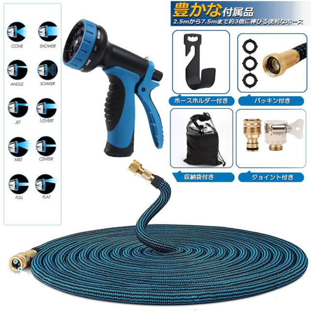 【3倍に伸びる】:収納時5m、最大15m、ホースを蛇口に取り付けてると、5mから15mまでホースが水圧で約3倍に伸びる便利なホース。(水圧によって最大限まで伸びれない場合があります)【超軽量素材】:使用しない時は、ホースの重量はわずか900gです。従来のゴムホースのような面倒くさい収納法に対し、伸縮ホースは超軽量素材を利用して全然重くないですから、誰でも楽にご収納いただけます。