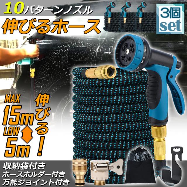 ホース 散水ホース 3個セット ホースリール 伸縮ホース 伸びるホース 洗車ホース 15M 3倍に伸びる 10パターンノズル 超軽量 伸びるホースノズル 散水ノズル コンパクト収納 洗車 ガーデニング 庭 ベランダ 玄関 散水 大掃除 収納袋 付き