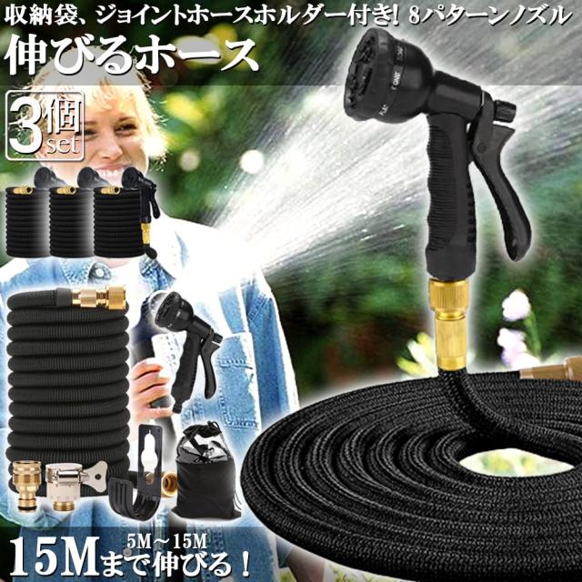 ホース 散水ホース 3個セット ホースリール 伸縮ホース 伸びるホース 洗車ホース 3倍に伸びる 15Mまで 超軽量 伸びるホースノズル 散水ノズル コンパクト収納 洗車 ガーデニング 庭 ベランダ 玄関 散水 大掃除 収納袋 付き